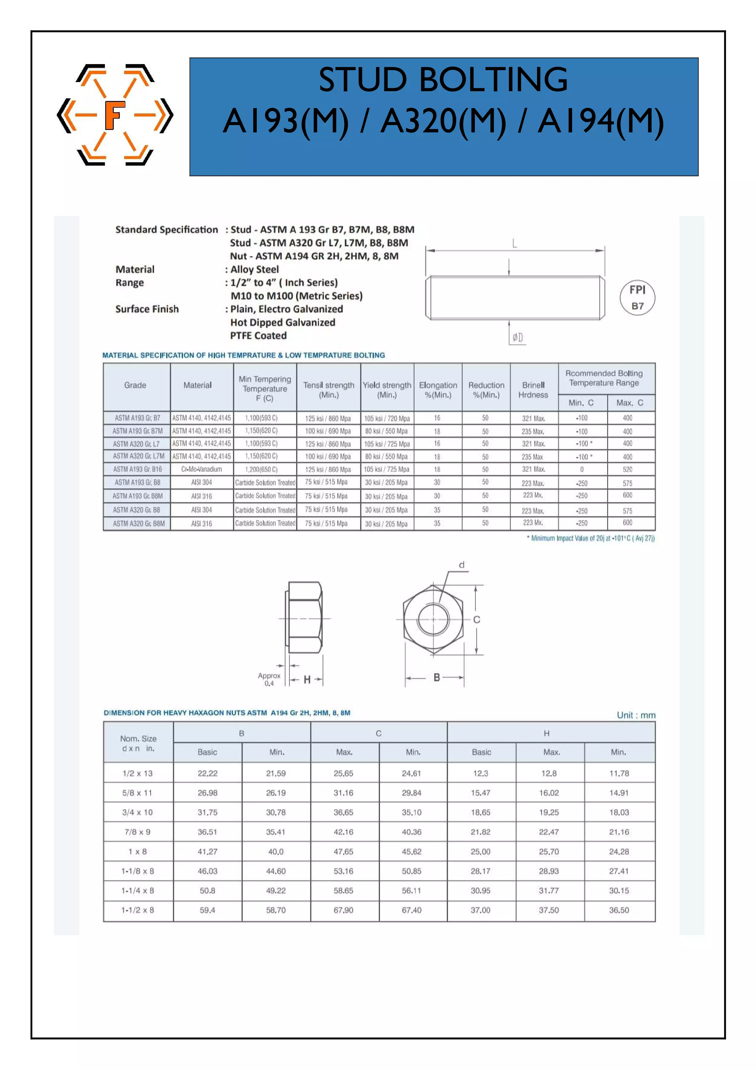 SpecificationComplete series of studs as per ASTM 193/M and nuts as per A194/M Series, Double Ended studs and as per customer drawing and specification.